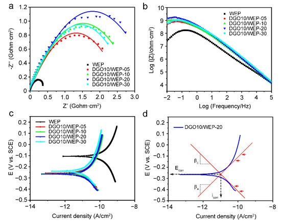 Figure 4. Nyquist diagrams (a), Bode diagrams (b), and potentiodynamic polarization curves (c) of waterborne epoxy resin coatings after immersion in 3.5 wt.% NaCl solution for 48 h. Tafel extrapolation on the polarization plot of the DGO10/WEP-20 sample for the determination of the corrosion current and Tafel slopes (d).