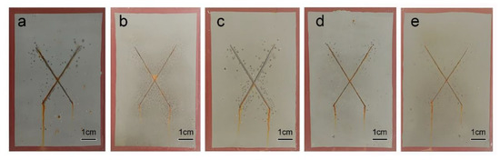 Figure 5. Waterborne epoxy resin coatings exposed to the salt spray test for 300 h. (a) WEP; (b) DGO10/WEP-05; (c) DGO10/WEP-10; (d) DGO10/WEP-20; (e) DGO10/WEP-30.