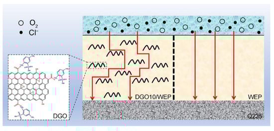 Corrosion of the metal matrix under the coating is caused by the redox reaction of the corrosive medium (H2O, O2, and Cl), which penetrates the coating through cracks and micropores to reach the interface of the coating and metal [27]. It is worth noting that H2O and O2 are necessary factors for the redox reaction. Therefore, the redox reaction on the surface of the metal matrix can be effectively prevented by preventing H2O and O2 from penetrating the coating to reach the metal surface. In our work, a “maze effect” was formed in the waterborne epoxy resin coating using DGO as a functional filler, as shown in Figure 7, which effectively extended the pathways for the corrosive medium to penetrate the coating and significantly improved the shielding and corrosion-protective properties. Moreover, the number of defects and micropores in the waterborne epoxy resin coating decreased significantly, and the local anode and cathode directions on the surface of the metal matrix were blocked effectively. Therefore, the shielding and corrosion-protective properties of DGO10/WEP were improved.
