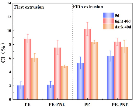 Long-term aging resistance: Carbonyl index (CI) was used to characterize the long-term aging resistance, according to the ratio of band area at 1550–1780 cm−1 (carbonyl group) and 2850–2920 cm−1 (C-H band of methylene groups) []. Thin films were used for the tests. Original CI values of samples were obtained with samples directly taken after hot compression. PE and PE-PNE samples were placed in the same space under daylight or in the dark for 40 days. Similar tests were carried out on the samples after 40 days to gain the CI value of long-term aging. Five tests were carried out for each sample, and the CI values in this paper are the average data.