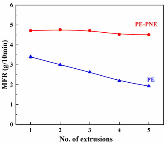 MFR values of PE and PE-PNE samples vs. the number of extrusions.