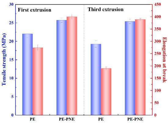 Tensile strength and Elongation at break of PE and PE-PNE samples vs. the number of extrusions.
