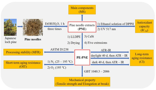 According to our previous studies, puerarin and forsythia suspensa (traditional Chinese medicine) extracts could act as efficient stabilizers for polyolefin [,]. It is known that traditional Chinese medicine has a wide range []. Could any other ones have similar properties? Pine needles, also known as bristle pine leaves and pine hairs, are the leaves of pine plants in the Pinaceae []. It is found that pine needles have remarkable pharmacological effects (such as lowering blood sugar, regulating blood lipids, inhibiting tumors, and anti-aging) [,,,]. It is also well-known that both fresh and fallen pine needles hardly rot. We suspect that this phenomenon is due to the antioxidants inside pine needles. Combined with the reported medical effect, we believe that pine needles could play a role in the antioxidant modification of LLDPE. If true, more values could be added to pine needles besides returning to the soil. In addition, the usage of such waste would be a benefit for the polyolefin industry. To accomplish such objectives, low-density linear polyethylene (LLDPE) was chosen as the polymer matrix in this study. Pine needles were extracted with ethanol aqueous solution, and the performance of pine needle extracts (PNE) in stabilizing LLDPE was investigated in terms of short-term/long-term aging resistance and mechanical properties. Possible roles of PNE against the degradation of LLDPE were proposed.