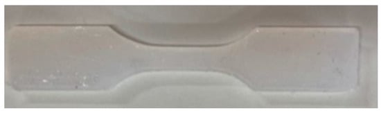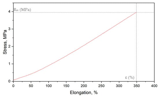 The static tensile test was performed using a Shimadzu kN10D testing machine (Shimadzu Corporation, Kyoto, Japan) following the standard ISO 527 []. The crosshead speed was 50 mm/min. The samples were 60 mm long and 4 mm wide along the measuring length (ISO 527-1–type 5-B (Figure 3)). Stress at break and elongation at break were determined based on the example diagram presented in Figure 4.