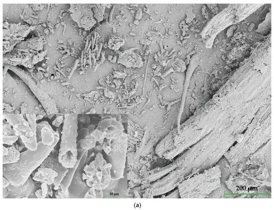 Both fillers have developed surfaces with structures of different sizes. In thyme micrographs (Figure 5a), the grains are characterized by bent, unbranched, needle-like trichomes (structures responsible for protection and odor) with a rough surface and visible stomas. At higher magnification, it can be observed that the trichomes are opened. This is related to the grinding process, due to which the trichomes release an odor characteristic of thyme. In addition, grains’ sizes vary from smaller, shorter structures to bigger, longer ones, which is proved in particle size analysis in Section 3.2. In addition, the grains exhibit extensive internal structures showing high porosity, affecting the matrix’s adhesion. Like thyme, sage’s grains are characterized by visible stomas and trichomes; however, they are longer and form a far-reaching net rather than multiple assemblages (Figure 5b). The differences between the fillers are mainly related to the nature of the plants and their individual behavior during the grinding process. It should be noted that despite the purchase of dried fillers and then subjecting to additional drying, the method used for drying fresh herbs, which may additionally affect the grinding behavior of the herbs, is unknown to the authors. The well-developed surface of the fillers is one of the main factors influencing the properties of the obtained composites. Moreover, thyme stalks are highly branched (after years, they become woody), and the leaves reach a size of up to 4 cm. Woody stems affect the properties due to increased hardness. In the case of sage, the leaves are mainly used and do not show any woody parts, which does not significantly affect the test results. Woody parts can act like a notch, affecting the results’ scatter [].