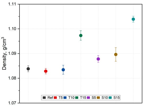 The density of the obtained composites differed from that of silicone, which is also related to the bulk density of herbal powders—approx. 0.29 g/cm3 []. The density of pure silicone was 1.08 g/cm3, and for the highest fraction, it changed to 1.1 g/cm3, so it could be concluded that the density depends on the content of the herbal powders. However, the differences are within the error limits. Statistical significance was found (F (6,28) = 26.86, p < 0.001); however, post hoc analysis revealed that the change is only significant in composites with 15 wt.% of thyme and sage. This may be due to the fact that these composites have a higher filler fraction than the rest, and due to the hygroscopic nature of the herbs, the materials are more prone to absorbing moisture, which affects the bulk density. In addition, the content of the woody parts may be an important factor that could potentially influence the standard deviation. The highest standard deviation was observed for composites with higher contents. The presence of moisture is also related to the powders’ structure.