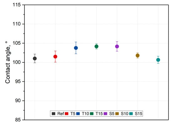 The incorporation of thyme increases the silicone surface contact angle, and the higher the filler fraction, the bigger the contact angle value. The opposite is observed for sage-filled composites. This is undoubtedly related to the herbal composition (the content of the desired compounds). Sage has a higher acid content than thyme, which affects the nature of the changes in properties (Figure 2). Nevertheless, these changes are within the error limits. Although statistical analysis proved the relevance of the changes (F (6,53) = 3.68, p < 0.001); post hoc analysis revealed that the composite incorporated with 15% of thyme alters the contact angle significantly compared to the native material, while the remaining composites’ impact is statistically trivial.
