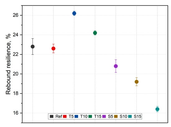To evaluate the prepared composites’ elasticity, a rebound resilience test was carried out using Schob machine (Heckert, Chemnitz, Germany). Test samples were mechanically conditioned with two impacts before testing. Each sample was tested three times in accordance with the standard ISO 4662 [].
