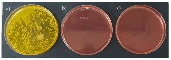The samples were prepared, and the test was carried out following the standard ISO 22196 []. Three samples of each material (40 mm × 40 mm square dimensions) were tested against Staphylococcus aureus ATCC 6538 strain. The first step was to inoculate the strain onto Mueller Hinton agar and incubate it at 35 ± 1 °C for 24 h. Next, the test specimens were disinfected using ethanol and placed in Petri dishes. A cell suspension of S. aureus—1.1 × 106 CFU/mL (colony forming unit/mL)—was prepared, and a 0.4 mL drop was placed onto the surface of the tested specimens. The samples were covered with 70 μm thick ethylene vinyl alcohol (EVOH) films. The Petri dishes were placed in a container with sterile water and incubated at 35 ± 1 °C for 24 h. In the next step, the samples were washed with 10 mL of D/E neutralizing broth, and decimal dilution was carried out. From each dilution and the control sample, 1 mL was transferred to a Petri dish filled with agar and filled with nutrient broth. Next, the plates were incubated at 35 °C for 24 h, after which bacterial colonies were counted. The reduction log was calculated based on the initial inoculum and subtracting the log10 count of the control group.