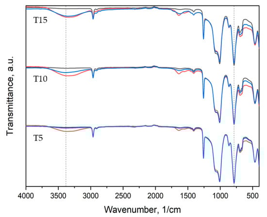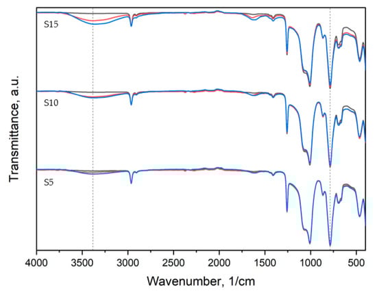 The following supporting information can be downloaded at: https://www.mdpi.com/article/10.3390/polym15010042/s1, Figure S1: IR spectra of the obtained materials in the Si-CH3 stretching band: reference—a, T5—b, T10—c, T15—d, S5—e, S10—f, S15—g; Figure S2: IR spectra of the obtained materials in the –OH stretching band. Table S1. Thermal transitions determined by DSC.