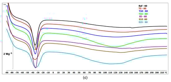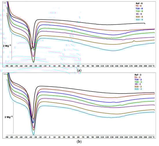 DSC analysis of the reference samples and after accelerated aging was performed at temperature scan mode using a DSC 1 model differential scanning calorimeter (Mettler Toledo, Greifensee, Switzerland). Specimens of 20–21 mg were weighted in an XS105DU analytical balance (Mettler Toledo, Greifensee, Switzerland). Samples were hermetically closed in aluminum pans with lids (40 µL) (a new pan for each test was used). Samples were heated from −90 °C to 220 °C at a rate of 20 °C per minute and cooled at the same rate in a nitrogen atmosphere (60 mL min−1). DSC results were analyzed using the supplied software STARe Mettler Toledo. The test was carried out following the standard ISO 11357-1 [].