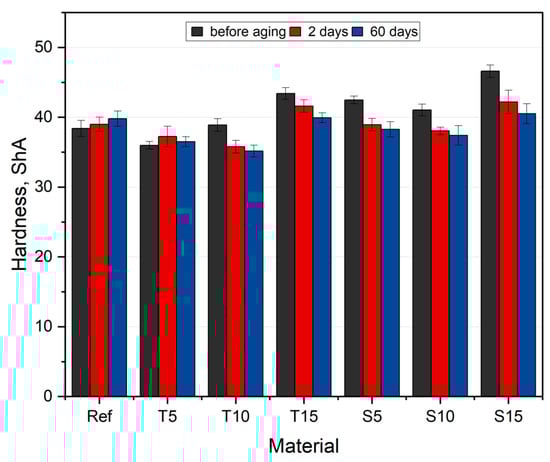 The resilience of the materials changes depending on the filler type and fraction. The rebound resistance value of T5, T10, and S5 composites is greater than that of silicone. The inverse proportional dependence of rebound resilience on the content is observed for the tested composites, but the values of sage composites are lower than for thyme-filled composites. These differences may be due to the shape of the fillers and the developed surface increasing the moisture absorption, which, in turn, weakens the material. Moreover, sage has a higher crude fat content than thyme, which influences the hardening process of silicone and changes its mechanical properties []. The proposed modification of the fillers under the influence of ethanol partially removed the undesirable compounds, e.g., fats. This impacted the fiber and matrix adhesion and the cross-linking process. The most significant decrease is noted for S15 (approx. 19%) compared to the reference samples. One-way ANOVA analysis found the changes to be significant (F (6,28) = 56.26, p < 0.001). In relation to the native material, essential changes were noted for T5 and S15.