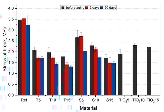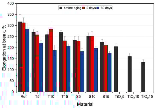 All materials, except for T10, show a decreasing tendency of elongation at break value with increasing aging days. For native samples, the highest value drop is observed for S15 (29%), while the lowest drop is observed for T5 (15%). For reference, the TiO2-filled PDMS exhibited lower elongation at break compared to the studied materials []. Among aged composite samples, T10 has the highest elongation at break value, while the lowest is characterized by S15. Sage composites exhibit a similar drop in value after 60 days of aging for all fractions (around 21%). The conducted statistical analysis proved the impact of the filler and aging time on the tensile strength (p < 0.05).