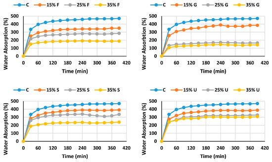 Water acts like a plasticizer by improving the flexibility of the material [34]. Nevertheless, water absorption is not a desirable property, because of the change of the dimensions; swelling is a result of water particle absorption. The hydrophilic nature of a plasticized film decreases with the addition of plasticizer content, which means higher water content in the film leads to increased water saturation. Hydroxyl groups in starch and plasticizer particles are the reason for the high water absorption of the plasticized polymer [35]. Plasticizers can combine with starch by producing hydrogen bonds. Plasticizers’ OH groups can establish hydrogen bonds with starch. The water absorption is consistent with the water solubility and water content.