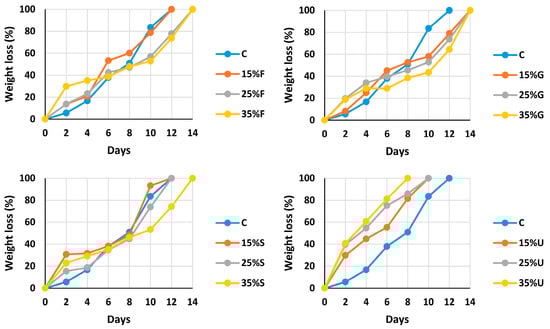 Burying the samples in moist soil caused enzymatic degradation. Figure 3 shows the degradation percent every two days; it was found that the addition of the different plasticizers reduces the degradation. Except for urea films, which showed the fastest decomposition, 35%U fully degraded within 8 days. It was difficult to handle films plasticized with urea because of the fragmentation that occurred after one week; this fragmentation also happened with the other films after 10 days. The degraded mass increased until it reached 0% within two weeks. Many bacteria and fungi in the soil environment can break down starch’s primary ingredients (amylose and amylopectin). Microorganisms can attack the carbohydrate structure and have particular enzymes that can hydrolyze these polymers into digestible units [37]. From the result in Figure 3, it is clear that the addition of a plasticizer reduces the acceleration of the degradation, which means that the plasticizer creates stronger bonds and improves particles adhesion.