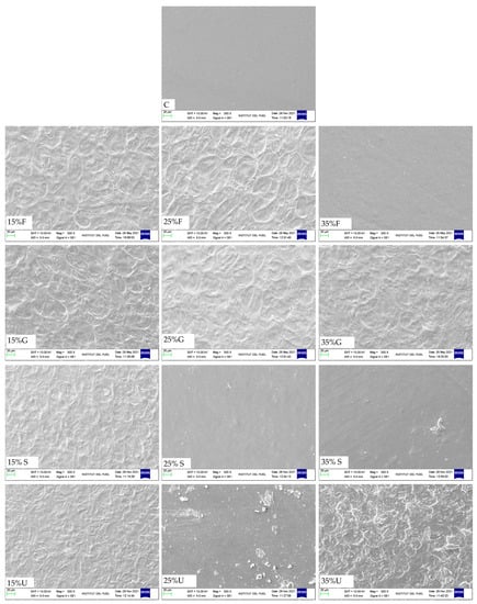 To develop useful and effective bioplastic, the transformation of the moisture between the plastic sides needs to be reduced [38,39]. Table 1 shows that the addition of the plasticizer increases the WVP; similar results were recorded by Muhammed L. Sanyang et al. [19] and Muscat et al. [40]. Films plasticized with urea showed the highest WVP; 35% urea revealed 1.88133 × 10−10 g·mm·s−1 m−2 Pa−1, while the addition of glycerol showed the lowest WVP, starting with 0.907385 × 10−10 g·mm·s−1 m−2 Pa−1 for 15% glycerol until 1.387 × 10−10 g·mm·s−1 m−2 Pa−1 for 35% glycerol.