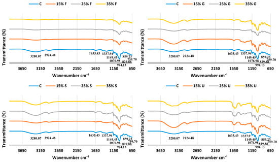 The interaction between the particles of wheat starch and plasticizers was investigated with an FT-IR spectroscope; the FTIR spectrum curve was classified into four primary sections: the first section had wavenumbers less than 800 cm−1, the second section between 800 and 1500 cm−1 wavenumbers, the third section ranged from 2800 to 3000 cm−1, and the last section had wavenumbers above 3000 cm−1 [45]. Because the elemental makeup of the plasticized films was based on the starch structure, the curves were essentially identical, as shown in Figure 5.