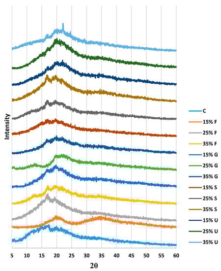 To study the effect of different plasticizers in various concentrations on the crystallinity index, an XRD test was conducted. Figure 6 shows the crystalline peaks of plasticized wheat starch films. It shows that plasticized films have a lower crystallinity than the control film. The amount and type of plasticizer did not significantly affect the crystallinity of the films; after making the comparison, all plasticized films had a lower crystalline index than the control film. The plasticizers showed that the urea and fructose films had a higher crystallinity than the sorbitol and glycerol films, as shown in Table 1.