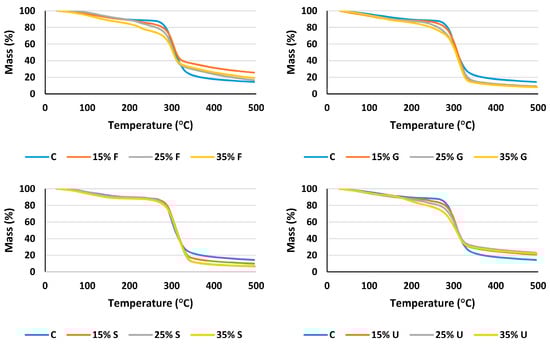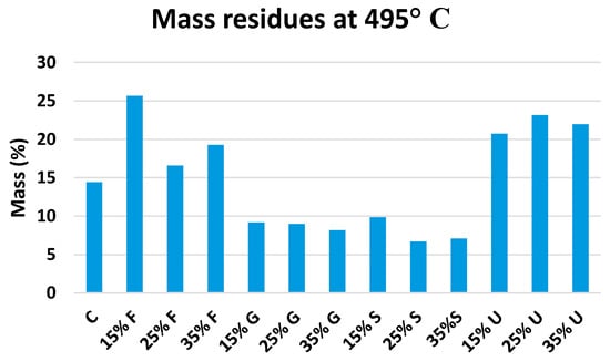 The derivative thermogravimetric (DTG) curves show three distinctive phases of the degradation process. The initial mass loss was produced by a thermal drop below 125 °C, which was mostly due to the elimination of moisture and water fragments via evaporation [55,56]. The second phase began with further heating at temperatures ranging from 150 °C to 250 °C. This mass loss can be attributed to the volatilization of plasticizer molecules in the presence of water [57]. Sorbitol and glycerol did not show a separate phase for their volatilization; this refers to their low volatilization temperature [58], which makes them volatile after losing water content. At temperatures above 270 °C, the last step of film degradation’s mass loss was revealed. Weight loss was connected to the depolymerization and breakdown of carbon chains in the starch structure during this time. The onset of the thermal reactions of starches is widely known to occur at around 300 °C. [34]. According to the data in Figure 8, all films decompose at temperatures ranging from 298.6 °C to 312.4 °C; the lowest degradation temperature was recorded for the control film (298.6 °C), and the highest temperature recorded for 15% glycerol (312.4 °C). These findings show that adding plasticizers to wheat starch-based films did not significantly alter their thermal stability. From Figure 9, it is obvious that fructose and urea films have the highest mass residues at 495 °C. The addition of 15% fructose resulted in the highest mass residues at 495 °C (25.66%), while 25% sorbitol had the lowest (6.7%).