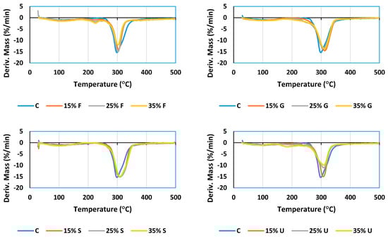 DTG curve of wheat starch plasticized films with various plasticizer types and concentrations.