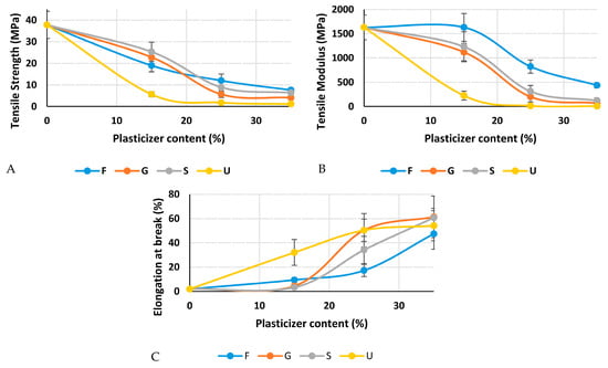 Mechanical properties of wheat starch plasticized films. (A) Tensile Strength, (B) Tensile Modulus and (C) Elongation at break. 0% is the control film.