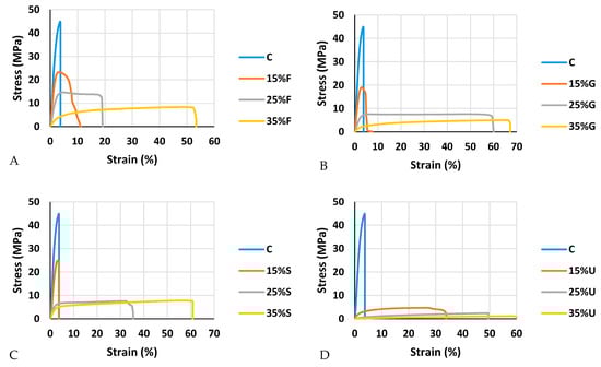 Stress–stain curves of wheat starch-based film with different plasticizers. (A) Fructose, (B) Glycerol, (C) Sorbitol and (D) Urea.