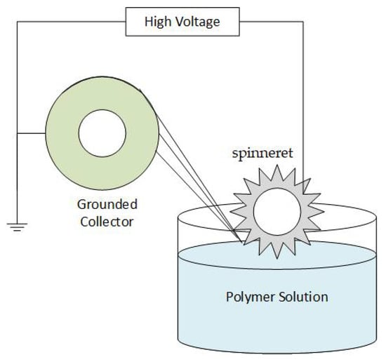 Electrospinning is a facile technique to fabricate extremely thin fibers from a wide range of materials, including polymers, ceramics, composites, etc. More than two hundred distinct types of polymers have been electrospun [4,10,30,31]. Although the name “electrospinning” (derived from “electrostatic spinning”) has only been in use since 1994, its basic concept has existed for more than sixty years. In 1934, Anton Formhals presented the pivotal patent in which he elaborated on the electrospinning of plastics. In a series of patents submitted between 1934 and 1944, Formhals explained the experimental setup for creating polymer filaments by utilizing electrostatic force [32]. To prepare polymer filaments, a cellulose acetate solution was introduced to an electric field. One electrode was dipped into the solution, and the second was placed on a collector. The charged solution jets were propelled from a metal spinneret having a tiny hole and evaporated to produce fibers, which were gathered at the electrically grounded collector. Figure 2 shows a diagram of the basic setup. Later, in 1971, Baumgarten developed a device to electrospin acrylic fibers with diameters ranging from 0.05 to 1.1 microns [33].