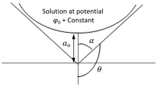 where is a Legender function of half order [40]. The free surface may have equipotential only when θ corresponds to zero of in the range , which is θo = 130.7° [39]. The droplet shown in Figure 4, is enveloped by a cone with the half angle at its tip equal to , which is a Taylor cone [27]. The shape of the droplet approaches the Taylor cone asymptotically as . (Note that Pantano et al., 1994 considered a finite drop attached to a tube [41].)