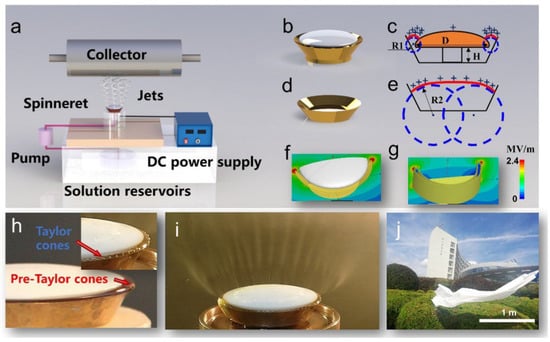 Mushroom-electrospinning process: (a) apparatus, (b) spinneret, (c) surface curvature and charge distribution on spinneret, (d) uncovered spinneret, (e) surface curvature and surface charge distribution of the uncovered spinneret. Concentrated electric field state of (f) the spinneret and (g) the uncovered spinneret. (h) Digital photograph of spinneret filling with solutions; the inset picture is photo of an annular array of Taylor cones under external electric fields. (i) Photo of multiple jets during electrospinning. (j) Resulting large-scale nanofiber membranes without any substrate via mushroom-electrospinning. Reproduced from [58] with the permission of Elsevier.