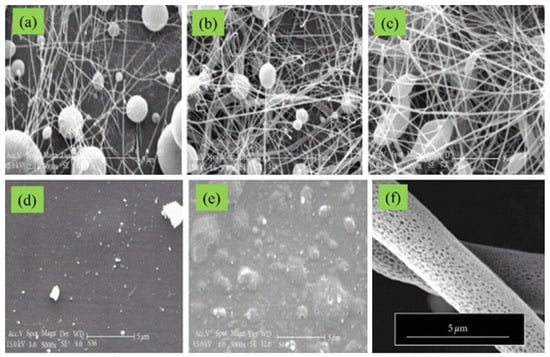 SEM images of 5% polycaprolactone solutions dissolved in various solvents: (a) glacial acetic acid, (b) 90% acetic acid, (c) methylene chloride/DMF = 4/1, (d) glacial formic acid, (e) and formic acid/acetone, along with (f) SEM images of polyvinyl butyral nanofibers prepared from 10 wt.% tetrahydrofuran/dimethyl sulfoxide (9/1 v/v). Reproduced from reference [92] with permission from Elsevier and Arabian Journal of Chemistry.