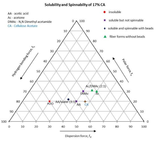 The choice of a good solvent and preparation of a suitable solvent system for the desired polymer are necessary for the generation of electrospun polymer nanofibers. Solubility parameters are combined to aid in the search for the desired solvent system. In literature, ternary solubility diagrams, also known as Teas graphs, are widely used for the selection of solvent systems. Fractional cohesion parameters fh, fd, and fp, which were introduced by Teas, are derived from the hydrogen bonding component δh, dispersion force component δd, and polar force component δp of Hansen parameters. Any solvent with specified Hansen parameters can be traced by plotting corresponding fractional parameters on a Teas graph. In one study, three solvent systems (acetic acid/water, acetone/Dimethylacetamide, and pure acetone) were used to prepare different cellulose acetate (CA) solutions with concentrations between 10 and 20 weight percent and also with different solvent concentrations. The solvents were analyzed by Hildebrand solubility parameter δ, and values for Hansen parameters were calculated for all solvents. The authors developed a Teas graph for the experiment, as shown in Figure 7 [94].