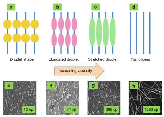 Most of the research indicates that viscosity is a prominent factor in analyzing diameter and morphology of the fibers. Enhancing the viscosity by molecular weight or by an increase in the polymer’s concentration increases the production of polymer fibers with a larger diameter, while the probability of bead generation is reduced, and fibers are more uniform in appearance. It was demonstrated that at very low viscosities, due to the deficiency of chain entanglement, there is no formation of any continuous fiber, and the fiber jet breaks into droplets. On the other hand, when a polymer solution has very high viscosity, it is difficult to shoot a jet from the solution, because the polymer flow stops at the needle’s tip. Viscosity of the solution is significantly correlated to the concentration of polymer. The relation between viscosity, concentration, and morphology of electrospun fibers has been examined by investigating polylactic-co-glycolic acid, polyethylene oxide, polyvinyl alcohol, poly-methyl methacrylate, and poly-l-lactic acid. Viscous solutions exhibit a longer duration for stress relaxation in the electrospinning process. Furthermore, by raising viscosity by concentration of the solution, the bigger and much more uniform fibers are produced. Viscosity is essential in analyzing the range of concentrations at which continuous fibers may be produced. Solutions having less viscosity and surface tension are prominent indicators for the generation of beaded fibers. Continuous nanofibrous structures were created while the concentration was above the optimal level, and morphology was influenced by the solution’s concentration [7,10,96,97]. In electrospinning, each polymer has an optimal viscosity which has significant influence on morphology of the resulting polymer nanofiber, as shown in Figure 8.