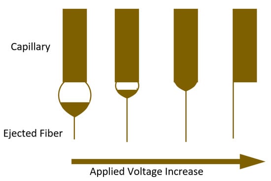 The influence of voltage on the size and morphology of electrospun polymer nanofibers has been subjected to significant controversy. It has been suggested that thicker fibers are produced by higher voltage, due to many exiting polymers. Others, however, have asserted that thinner fibers are produced as voltage increases because electrostatic repulsion forces are applied to the polymer jet. However, in the majority of situations, the rapid solvent evaporation and lower fiber diameter are caused by the higher enforced electric forces in the jet. Therefore, at high voltages, there is more chance of bead production. According to Larrondo and Manley, the diameter of the fiber is reduced approximately to half when the applied electric field is doubled. Deitzel et al. examined polyethylene oxide/water and observed that by enhancing voltage, the shape of the surface is altered where the Taylor cone and jet fiber formed, as shown in Figure 9 [87] [92].