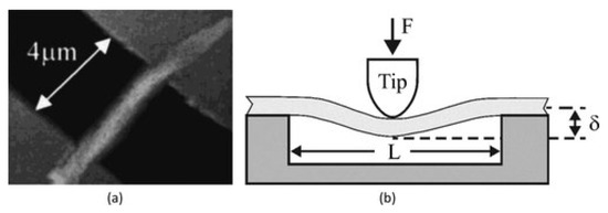 There were numerous attempts to investigate the mechanical behavior of electrospun nanofibers based on tensile tests on nanofibrous mats utilizing the universal testing machine [106,107]. The tension test entirely depends on nanofiber diameters, alignment, and entanglements inside nanofibrous mats. Therefore, this technique cannot be considered appropriate [108,109]. In order to address this problem, numerous alternative methods for the mechanical characterization of continuous nanofibers were presented [100]. Atomic force microscopy (AFM), which includes both force and distance sensors and can be operated in air, liquids, and vacuum, has become one of the generic characterization tools. However, AFM is just the primary tool for other measurement methods. Most of these methods rely on fibers’ tensile, bending, stretching, nanoindentation, and shear modulation frequency [100,110,111,112].