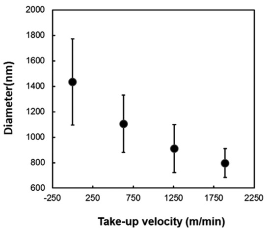 Although meso- and nano-porous materials, such as adsorbent granules and powders, can achieve large surface areas exceeding 2000 m2/g, fibers are easier to handle and more suitable for use in numerous crucial applications in contrast with powders. The benefit of large surface areas in organic fibers is frequently coupled with the flexibility of surface functionality, which can be utilized for a variety of applications, for example, biomedical applications, effective filtration, smart textiles, and improved fiber–matrix interaction for composite reinforcement applications [5]. Polymeric materials are widely utilized to manufacture nanofibers because of many attractive features and properties such as low cost, light weight, easy and diverse processing techniques, and flexibility of utilization and recyclability [6,7,8]. Combined characteristics found in polymer nanofibers make them strong candidates for such diverse and important applications [9,10]. Polymeric fibers’ remarkable features improve as the fiber diameter decreases from micrometer to submicron or nanometer. These include an extremely high surface area to volume ratio, pliability in surface functionalities, and superior mechanical properties compared to other materials. Due to their exceptional characteristics, polymer nanofibers are favored for a variety of applications [11].