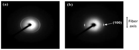 In the spinning technique, electrospun nanofibers experience significant elongation, with a draw ratio up to and a strain rate of s−1 [27,28]. Due to high strain and strong shear forces, highly aligned molecular chains develop along the fiber axis. However, in the spinning process, polymer chains are relaxed with sufficient molecular adjustment in fibers [23,25,29]. Additionally, it has been discovered that electrospun nanofibers are birefringent, which indicates molecular alignment [24].