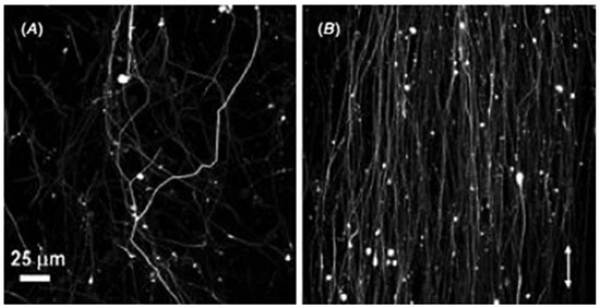 - Patel, S.; Kurpinski, K.; Quigley, R.; Gao, H.; Hsiao, B.S.; Poo, M.-M.; Li, S. Bioactive nanofibers: Synergistic effects of nanotopography and chemical signaling on cell guidance. Nano Lett. 2007, 7, 2122–2128. [Google Scholar] [CrossRef] [PubMed]