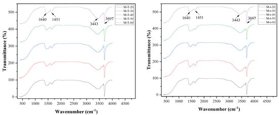 The surface groups of the synthetic powders are shown in the ATR-FTIR spectra. It can be seen in Figure 1b that the most obvious sharp and high-intensity absorption peak is located at 3697 cm−1, which is the contraction vibration peak of O-H in the crystal structure of Mg(OH)2. The characteristic peak of Mg-OH bending vibration is located at 1640 cm−1. The characteristic absorption peak representing the bending vibration of -OH is located at 1451 cm−1, and another characteristic absorption peak with a broad absorption band is located at 3443 cm−1. The reason for the absorption peak is the change of the free proton in Mg(OH)2 to the conductive state.