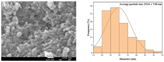 The SEM image and particle size of the GM-B-5/5 is shown in Figure 4b. The GM-B-5/5 image indicates that the modified nano-Mg(OH)2 is granular in the form of particles with smooth surfaces, and the dispersion performance of GM-B-5/5 is better with less agglomeration. The curve indicates that the particle size distribution of the GM-B-5/5 belongs to a normal distribution. The particle size of GM-B-5/5 is located within the range of 20–60 nm, and the average particle size is 36.45 ± 8.12 nm. Thus, the particle size of the modified powders is larger than that of the powders before modification.