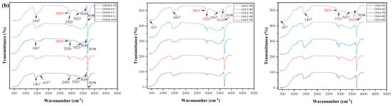 Figure 3b presents the ATR-FTIR spectra of the modified nano-Mg(OH)2. The vibrational peaks of nano-Mg(OH)2 are located at 3698 cm−1 and 437 cm−1, corresponding to the stretching vibrations of O-H and Mg-O, respectively. The peaks located at 3423 cm−1 and 2952 cm−1 are assigned to the -OH and -CH2 stretching vibration. The stretching vibration peaks of C-H at 2952 cm−1 and 2855 cm−1 are enhanced due to the addition of stearic acid modifier. Therefore, the new chemical bonds are formed between the nano-Mg(OH)2 and the modifiers.