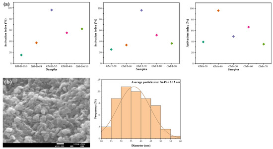 The (a) activation index of the modified powders and (b) SEM image and particle size distribution of GM-B-5/5.