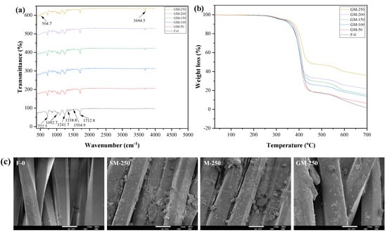 The TGA curves of the fabrics during the decomposition procedure are shown in Figure 5b. The weight loss attributed to water evaporation and thermal decomposition of the fabrics is calculated as a function of temperature. In terms of thermal stability, the fabrics show three stages of weight loss: the F-0 shows the weight loss between 28–340, 340–450 and 450–700 °C, while the functional fabrics show the weight loss between 28–360, 360–455 and 455–700 °C, respectively. At 700 °C, the functional fabrics show the relatively higher residue content than that of the F-0. The residue content of F-0, GM-50, GM-100, GM-150, GM-200 and GM-250 reaches 1.49, 6.45, 13.78, 15.32, 21.68 and 35.69%, respectively. The calculated modified nano-Mg(OH)2 content in GM-50, GM-100, GM-150, GM-200 and GM-250 are about 4.97, 7.32, 1.54, 6.36 and 14.01%, respectively, which is probably consistent with the attach ratio of the modified nano-Mg(OH)2 in GM-50, GM-100, GM-150, GM-200 and GM-250.