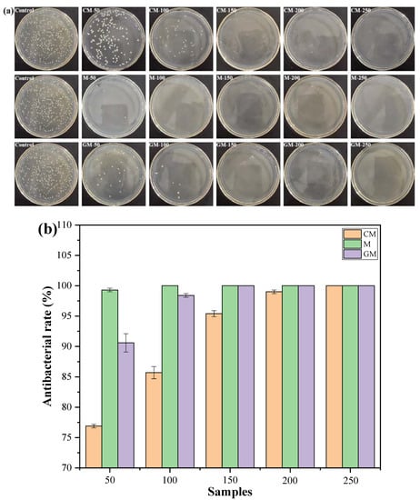 Figure 6a,b and Table 6 show the antibacterial property against E. coli of the fabrics. The E. coli colony can be visually observed on the LB agar plates of control, which is covered with E. coli colony (307 ± 5.9), while the E. coli colony number decreases as the content of the powders on the PET fabrics. When the content of the CM reaches 250 g/L, there is no colony on the LB agar plates (CM-250). As shown in Figure 6b, the reduction percentage of the E. coli colony number is calculated, and the antibacterial rate of CM-50, CM-100, CM-150, CM-200 and CM-250 reached 76.9 ± 0.3, 85.7±1.0, 95.4 ± 0.5, 99 ± 0.3 and 100 ± 0%, respectively. When the content of the M reaches 100 g/L, the CM-100 has no colony on the LB agar plates, and the antibacterial rate is 100%. When the content of the GM reaches 150 g/L, the GM-150 has no colony on the LB agar plates, and the antibacterial rate is 100%. The above results indicate that the fabrics have a certain antibacterial property against E. coli, which entirely depended on the powder content on the fabrics. Moreover, the antibacterial property are as follows: M > GM > CM. Thus, the modification process slightly reduced the antibacterial property of the synthetic nano-Mg(OH)2.