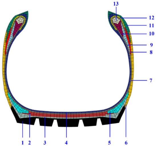 The cross-sectional profile and material distribution of the 12R22.5 TBR tire. (1) tread, (2) belt rubber, (3) under tread, (4) inner liner, (5) shoulder wedge, (6) sidewall, (7) carcass rubber, (8) filler, (9) soft apex, (10) hard apex, (11) abrasion, (12) strength, and (13) bead (steel).