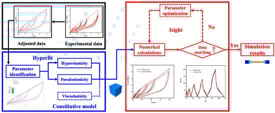 The flow chart of the numerical calculation of tensile recovery stress–strain responses of rubber materials is shown in Figure 2. The black box part represents the experimental data and adjustment module. The test data obtained from the quasi-static cyclic stretching experiments were processed to be adjusted data using a new method.