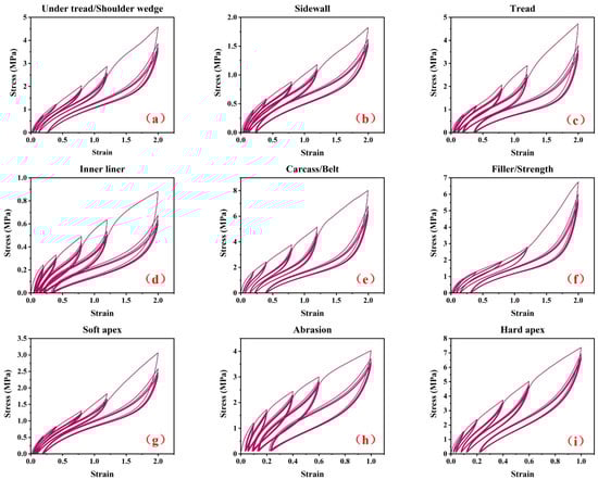 By using a CMT4104 electronic tensile tester (SANS, Ltd., Shanghai, China), The dumbbell-shaped specimens were stretched at a constant rate of 100 mm/min at room temperature. The quasi-static cyclic stretching experiments shown in Figure 3 were performed for nine different rubber specimens from the TBR tire. The mechanical curve in Figure 3a is for the under tread and shoulder wedge, Figure 3b is for the sidewall, Figure 3c is for the tread, Figure 3d is for the inner liner, Figure 3e is for the carcass rubber and belt rubber, Figure 3f is for the filler rubber and strength rubber, Figure 3g is for the soft apex, Figure 3h is for the abrasion, and Figure 3i is for the hard apex. The peak strain levels in Figure 3a to Figure 3g were 20%, 40%, 80%, 120% and 200%, respectively. Due to the low elongation at break for the abrasion and hard apex rubber, the peak strain levels in Figure 3h,i were 10%, 20%, 40%, 60% and 100%, respectively. Five cycles were performed for each peak strain level.