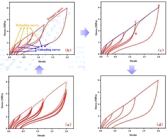 Figure 4a shows the raw experimental data of the carcass rubber and belt rubber (same data as in Figure 3e). Figure 4b was obtained according to the following operations: the primary curve is kept consistent, and the curves for each unloading segment are selected as the first experimental test results, while the curves for the reloading segment at each strain level are selected as the last experimental test results. In order to explain the adjustment process more clearly, we have modified and supplemented Figure 4c on the basis of Figure 4b. Figure 4d was obtained from Figure 4c according to the following operations: the high-order polynomial was used to perform high-precision fitting and reproduction of the original test result for the primary curve, and a redefined primary curve was obtained, as shown in the blue dotted line in Figure 4c. In addition, the unloading curve corresponding to the maximum strain level remains unchanged.