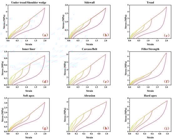 The raw stress–strain curves for nine different rubber specimens from TBR tire. (a) under tread and shoulder wedge, (b) sidewall, (c) tread, (d) inner liner, (e) carcass rubber and belt rubber, (f) filler rubber and strength rubber, (g) soft apex, (h) abrasion and (i) hard apex.
