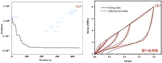 (a) The relation between the residuum value and the iteration number in the parameter identification process, and (b) comparison between the adjusted stress–strain data and the fitting results using the optimized material parameters of the hyper-pseudoelastic constitutive model.