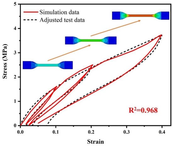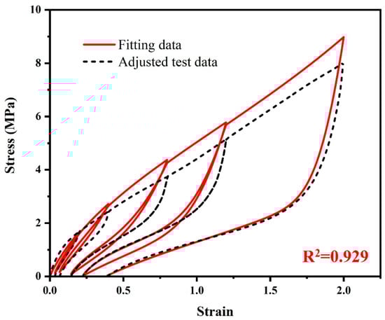 The comparison between the adjusted stress–strain data and the fitting results using the final optimized material parameters of the hyper-pseudo-viscoelastic constitutive model is shown in Figure 9b. The permanent set was described with high accuracy. The relative errors of the permanent set between the adjusted test data and the fitting data at different peak strain levels are recorded in Table 3. Except for the first strain level, the relative errors between the adjusted test data and the fitting data of permanent set at other strain levels are all less than 5%.